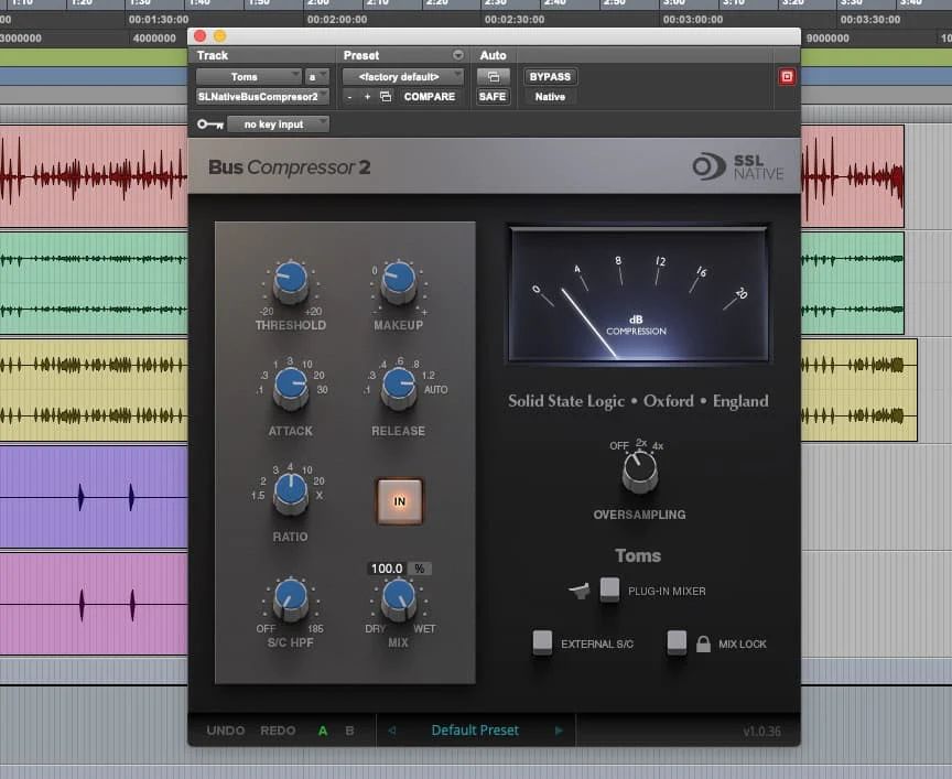 Der erste Schritt besteht darin, einen Kompressor entweder auf jede einzelne Tom-Spur oder auf einen Stereo-Tom-Bus zu legen. Einzelne Kompressoren geben Ihnen mehr Kontrolle, während ein Stereobus einen kohärenteren Sound ergibt.