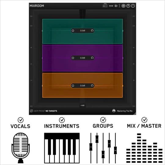 Du kannst jeden EQ für diesen Zweck verwenden, aber wenn du das zeitraubende Rätselraten satt hast, solltest du einmal das MIXROOM-Plug-in ausprobieren. MIXROOM ist ein intuitiver EQ, der dich mit anwendungsspezifischen Voreinstellungen und Zielfrequenzen auf der Grundlage einer Referenzspur ausstattet. Die Anwendung ist denkbar einfach: Richte das Plug-in einfach auf einer einzelnen Tom-Spur oder einem Stereobus ein, wähle eine geeignete Kanalvoreinstellung oder erstelle einen benutzerdefinierten Zielwert mit dem Zielsymbol in der unteren linken Ecke der Plug-in-Oberfläche und importiere eine Referenzspur. Mit der Target-EQ-Kurve von MIXROOM kannst du einen Sound auf Profi-Niveau erreichen, ohne mühsames Ausprobieren. Darüber hinaus kannst du mit der Schaltfläche »Smart Bands« hinzufügen EQ-Bänder einsetzen, die der Ziel-EQ-Kurve entsprechen. MIXROOM spart viel Zeit, selbst für erfahrene Mischtechniker. Denn wer würde nicht davon profitieren, intelligente EQ-Startpunkte direkt zur Hand zu haben?
