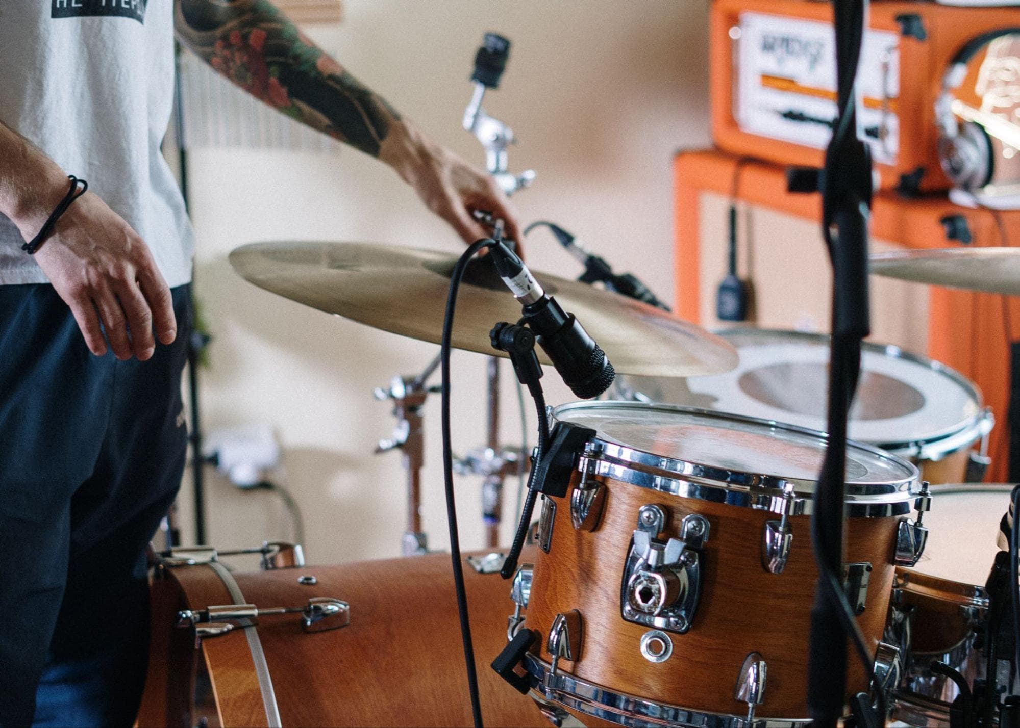 Da es sich bei den Toms um melodische Perkussionsinstrumente handelt, lassen sie sich durch das Stimmen auf die Tonart des Songs oft besser in den Mix integrieren. Das ist zwar nicht unbedingt notwendig, aber wenn du deine Toms auf die Tonart deines Songs abstimmst, vermeidest du dissonante Frequenzkollisionen und seltsame Schwingungen - die oft als unangenehmes Klingeln wahrgenommen werden - vor allem, wenn du zwei Toms gleichzeitig spielst. Außerdem kannst du die Toms so richtig ausklingen lassen - du musst sie nicht so stark dämpfen.