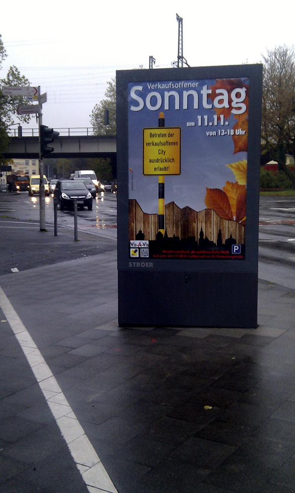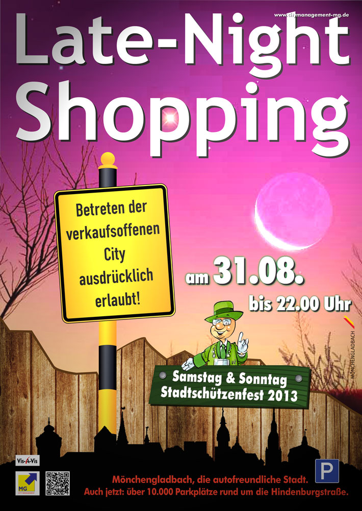 Die von uns umgesetzte Kampagne mit dem Slogan "Betreten der verkaufsoffenen City ausdrücklich erlaubt!" erhält eine "LateNightShopping -Variante". Unterstützung für den Hinweis auf das parallel laufende Stadtschützenfest in Mönchengladbach erhielten wir durch den Bund der Historischen Deutschen Schützenbruderschaften vertreten durch Horst Thoren, der/die uns das typisch von Nik Ebert karikierte Schützenmännchen zur Verfügung stellte. Weitere Infos zum verkaufsoffenen Sonntag Mönchengladbach und zu den Aktivitäten des Citymanagements gibt es unter www.citymanagement-mg.de.