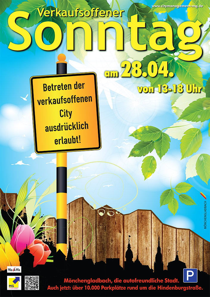 Die Kampagne ist komplett: nun gibt es auch die Frühjahrsausgabe der bereits mehrfach individuell gestalteten Plakate für die Verkaufsoffenen Sonntage des CityManagements Mönchengladbach.